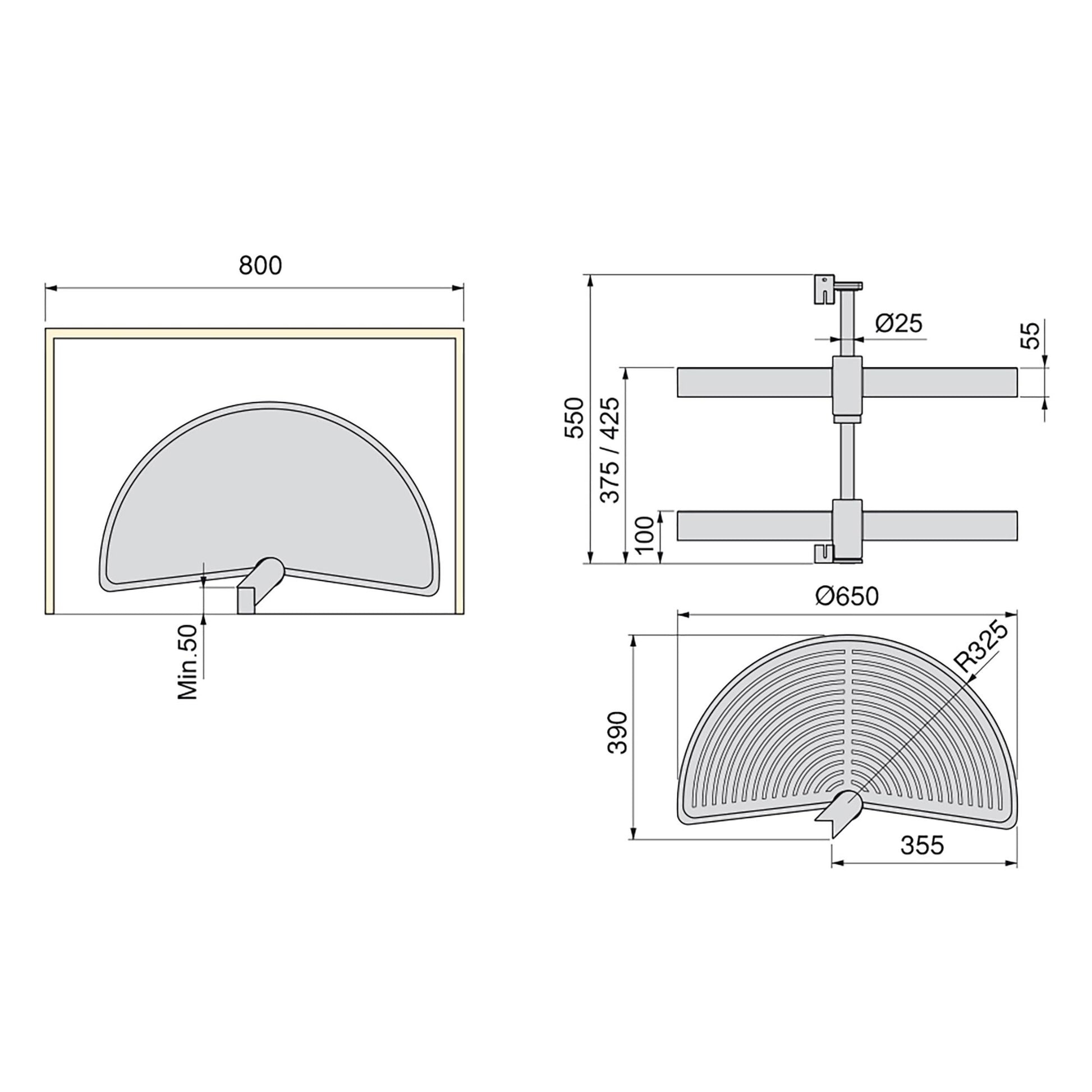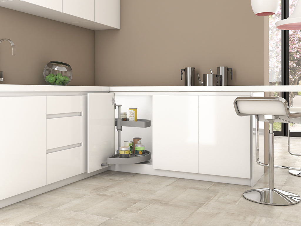 Bandejas giratorias media luna diseñadas para aprovechar el espacio en muebles rinconeros de cocina con forma de L. Son de fácil instalación y adaptables a diferentes alturas de módulos. Están disponibles para medidas de módulos de 800 mm y 900 mm y en acabados blanco y gris . El sistema está compuesto por 2 bandejas y accesorios de montaje fabricados de plástico reciclable, antiestático, de alta resistencia a impactos y a los rayos ultravioletas y por una barra central de aluminio en acabado anodizado mate. Tienen una capacidad de carga de 20kg por bandeja.