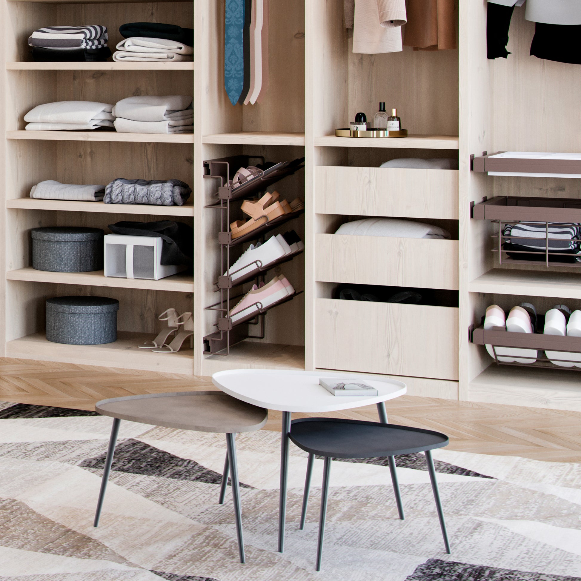 El zapatero lateral extraíble Moka permite organizar de forma eficiente el espacio en el interior de armarios y vestidores, facilitando el acceso a las prendas. Está fabricado en acero con acabado pintado en marrón moka y plástico, y sus guías disponen además de cierre suave.